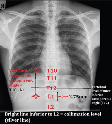 Results: The radiographs of 222 male and 216 female (n = 438) individuals were analyzed. 5.5 cm collimation coincided with L2 to T11 levels with 61% of individuals having costophrenic angles at T12 while only 3.7% had it high up at T10. No incidence of costophrenic angle cutoff was observed.