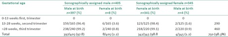 Materials and Methods: A retrospective cohort study was carried out over a 2-year period. The birth gender of 750 women who were scanned during the index pregnancy and the fetal sex noted on routine ultrasound were compared to find out how accurate the gender was determined by ultrasound. The data obtained were subjected to statistical analysis.