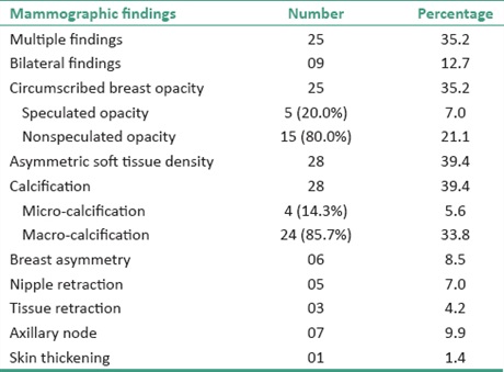 Results: Study population comprised seventy-one patients aged 20 to 79 years with a mean age of 48.3 years ±9.5, and range of 20 - 70 years. Of these, forty (56.3%) presented with breast pain, twenty-five (35.2%) had palpable breast lump, while fourteen (19.7%) presented with nipple discharge. 74.65% percent of participants showed positive mammographic findings. These were a well circumscribed breast opacity (35.2%), asymmetric soft tissue density (39.4%), calcification (39.4%), breast asymmetry (8.5%), nipple retraction (7.0%), tissue retraction (4.2%), skin thickening (1.4%), and axillary nodes (9.9%). Mammography calcifications were noted in 28 cases. Four of these (14.3%) were micro-calcification, while 24 (85.7%) were various forms of macro-calcifications.