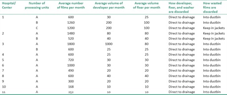 were selected. These are the hospitals and private centers that use automatic, manual, or both processing methods in their units. An unstructured interview was conducted with the technician in-charge of the various processor units. The audio-taped interview was converted to text notes for content analysis. The data were analyzed using standardized, open-ended content approach. Samples of spent solutions were analyzed for silver concentration using quantitative analysis.
