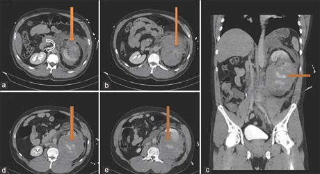 injury and hemodynamic instability after a fall. Computed tomography of the abdomen after resuscitation showed shattered left kidney with disruption of the renal hilum and features suggestive of active bleeding. Due to the hypovolemic nature of the patient, embolization of the renal artery was requested. With anesthetic support and antibiotic cover, the right common femoral artery was punctured and a 5 French sheath inserted. Both left renal arteries were selectively catheterized and embolized to stasis with coils. An Angio-Seal device was deployed in the groin and no immediate complications seen. The patient was discharged few days after. This case report shows that Grade 5 renal artery can also be managed through a minimal invasive procedure to reduce the length of time at the hospital and also reduce the metabolic response of the patient.